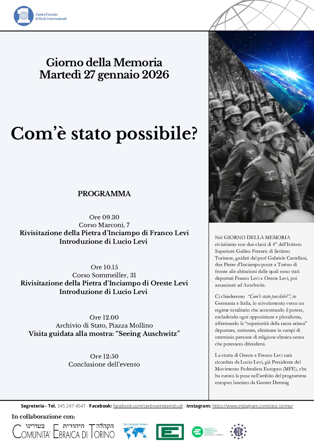 Il 27 gennaio 2026, in occasione del Giorno della Memoria, il Centro Einstein di Studi Internazionali, in collaborazione con la Comunità Ebraica di Torino, AEDE, Movimento Federalista Europeo e Gioventù Federalista Europea, ha organizzato l’evento "Com’è stato possibile?". L’iniziativa ha coinvolto due classi di 4° dell’Istituto Superiore Galileo Ferraris di Settimo Torinese, accompagnate dal professor Gabriele Castellani.