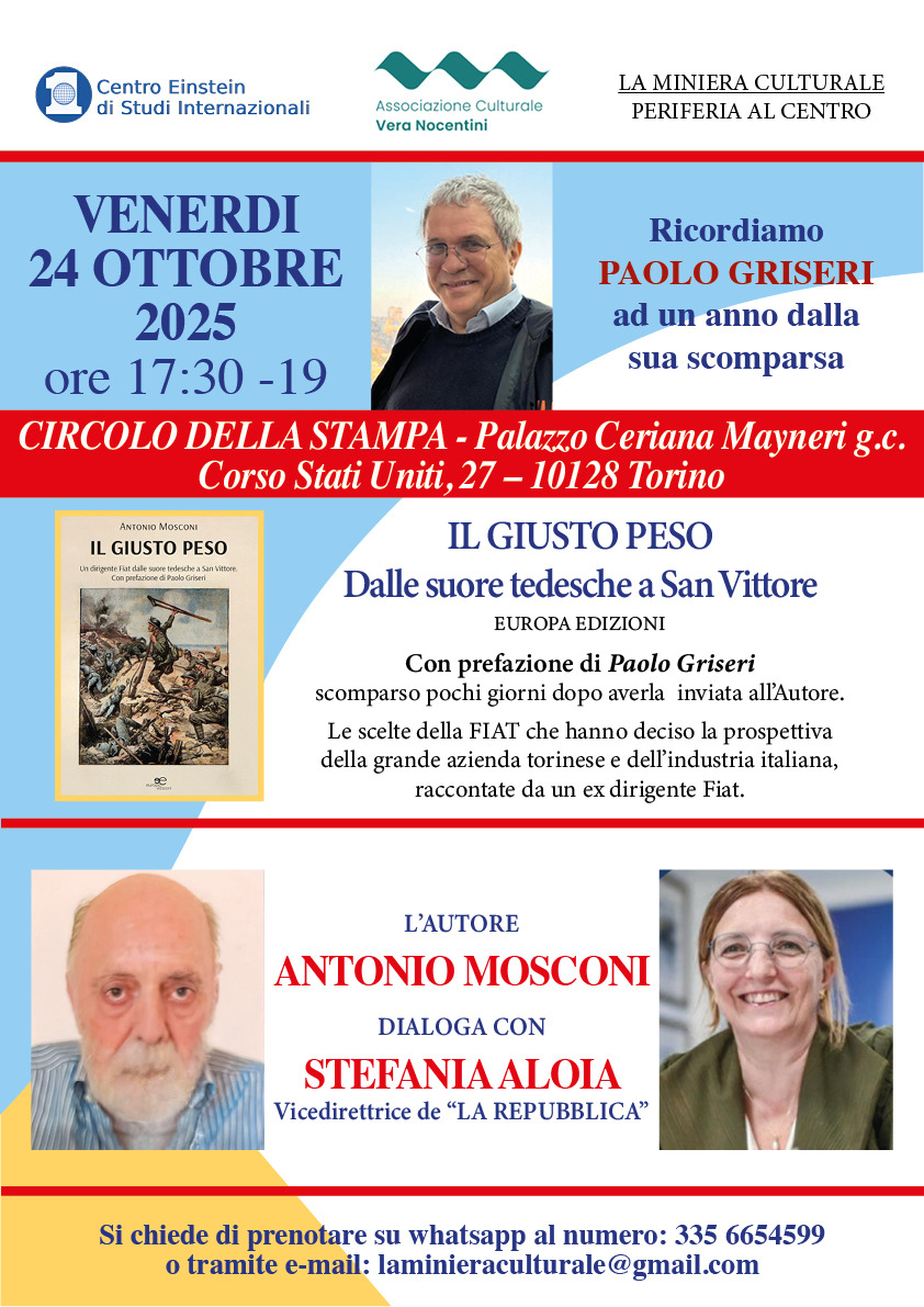 Venerdì 24 ottobre 2025, alle ore 17:30, presso il Circolo della Stampa in Palazzo Ceriana Mayneri (Corso Stati Uniti, 27, Torino), si terrà la presentazione del libro Il giusto peso. Dalle suore tedesche a San Vittore di Antonio Mosconi, edito da Europa Edizioni. L’evento, organizzato dal Centro Einstein di Studi Internazionali e dall’Associazione Culturale Vera Nocentini, con il patrocinio della Miniera Culturale Periferia al Centro, vedrà la partecipazione di Antonio Mosconi, che ricorderà l'amico Paolo Griseri, autore della prefazione, a un anno dalla scomparsa.