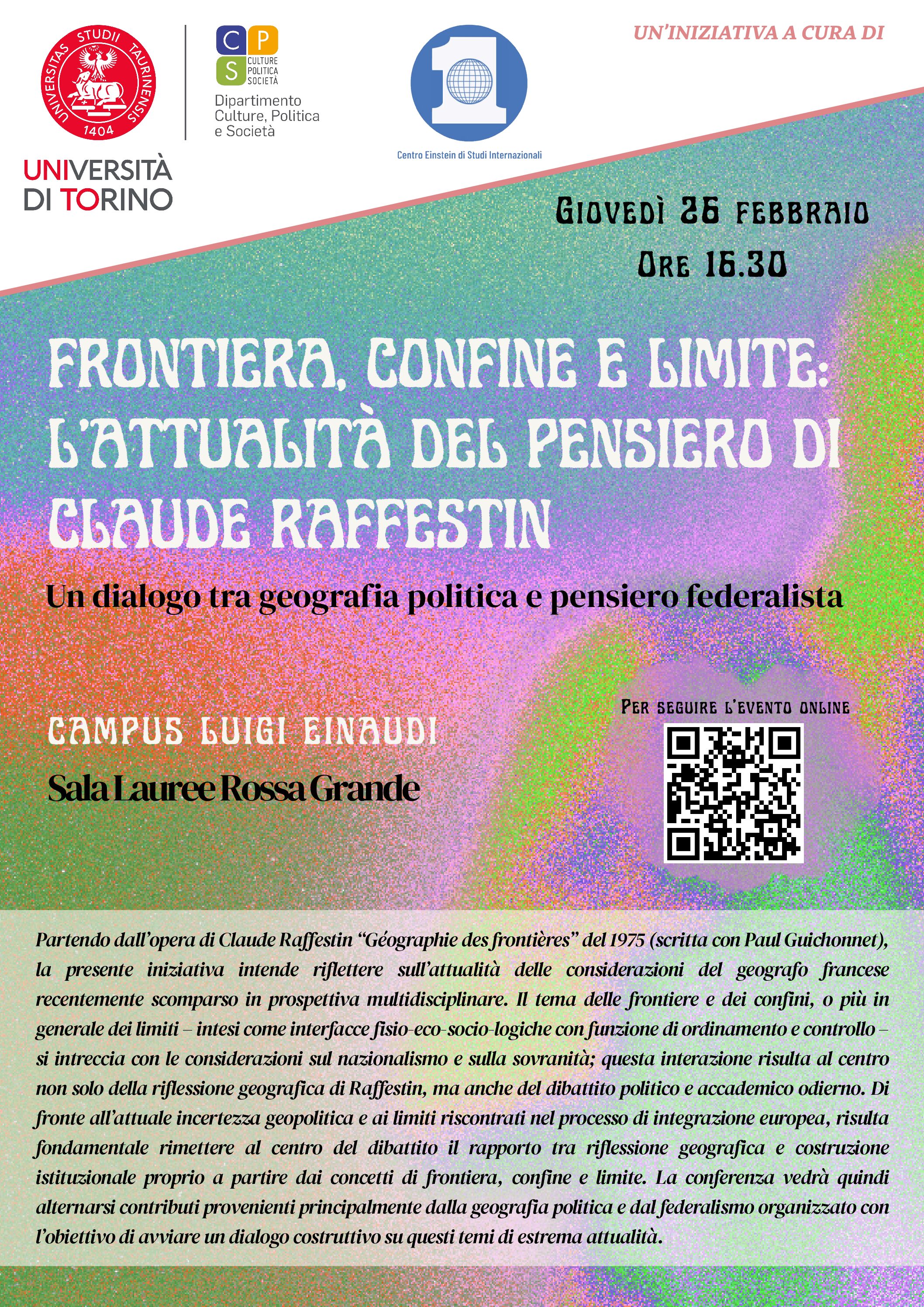 Giovedì 26 febbraio 2026 alle ore 16.30 si terrà presso la Sala Lauree Rossa Grande del Campus Luigi Einaudi di Torino il convegno “Frontiera, confine e limite: l’attualità del pensiero di Claude Raffestin. Un dialogo tra geografia politica e pensiero federalista”. L'ingresso sarà libero e aperto a tutti fino ad esaurimento posti. Per gli interessati impossibilitati a presenziare, l'evento sarà trasmesso in diretta streaming.