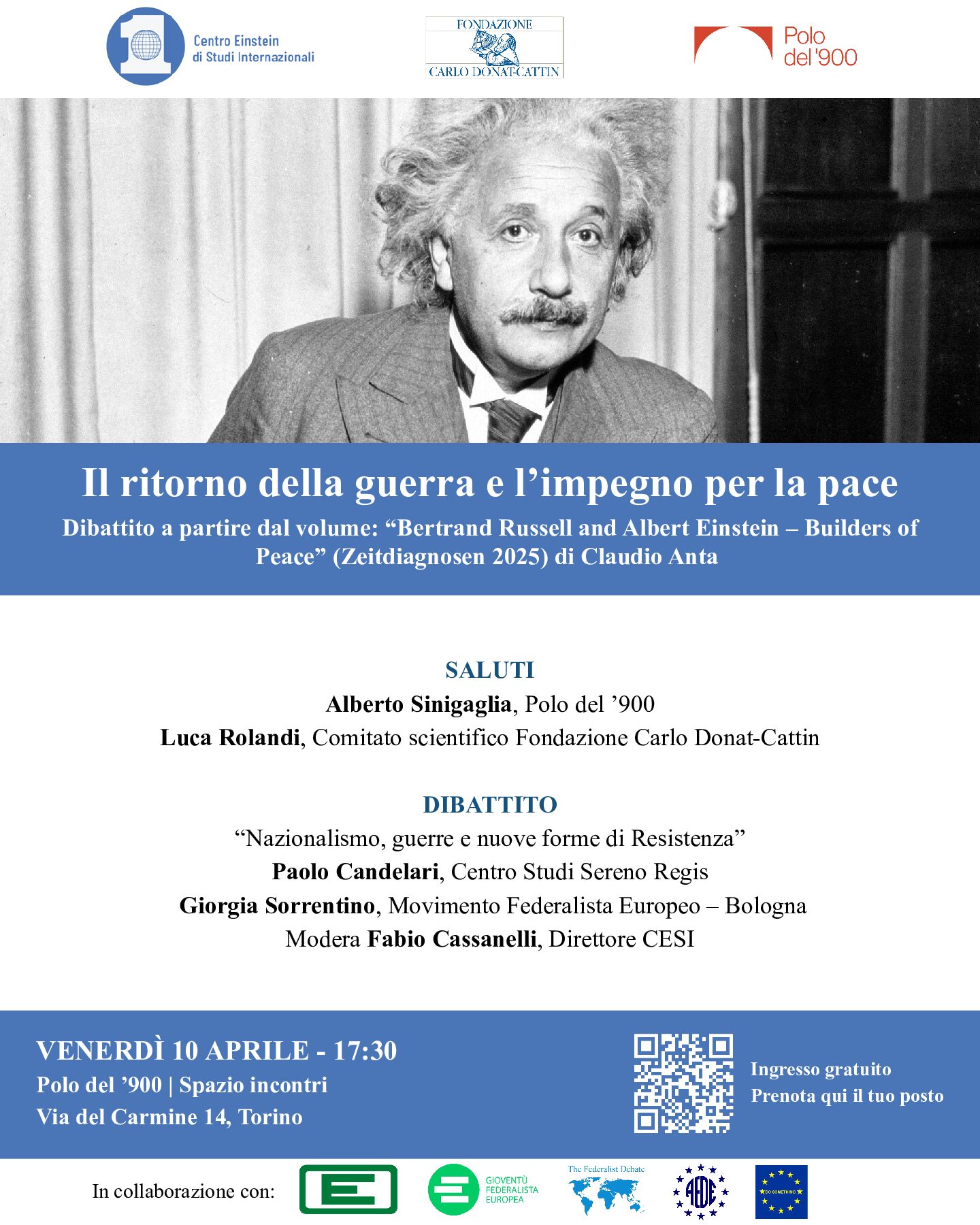 Il 10 aprile 2026, alle ore 17:30, presso lo Spazio Incontri del Polo del '900 in Via del Carmine 14 a Torino, il Centro Einstein di Studi Internazionali, in collaborazione con la Fondazione Carlo Donat-Cattin e il Polo del '900, organizza il dibattito "Il ritorno della guerra e l’impegno per la pace". L’evento prende spunto dal volume Bertrand Russell and Albert Einstein - Builders of Peace di Claudio Anta, e si propone di riflettere sulle sfide attuali poste dal nazionalismo, dalle guerre e dalle nuove forme di resistenza pacifica.